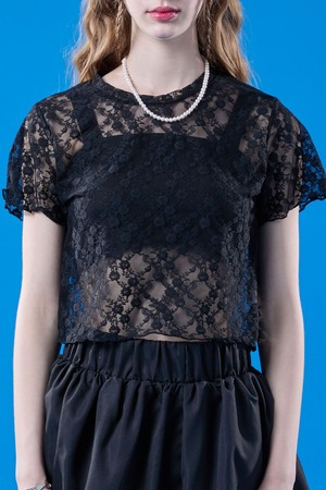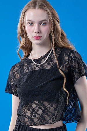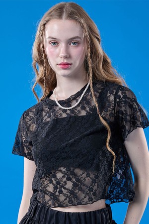 레이어드 플라워 시스루 크롭 반팔티 [BLACK]
