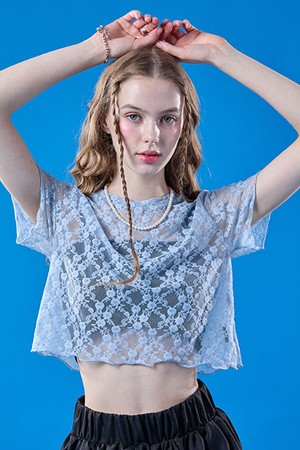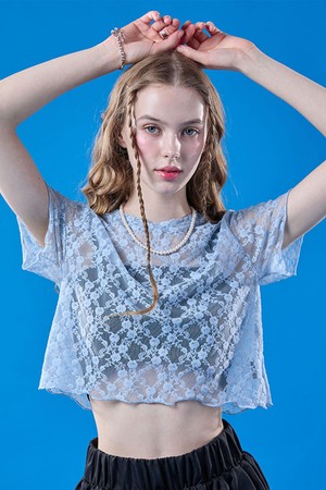 레이어드 플라워 시스루 크롭 반팔티 [BLUE]