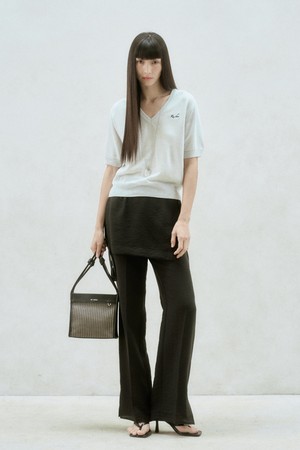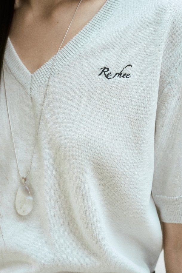 V NECK LOGO EMBROIDERED KNIT TOP SILVER