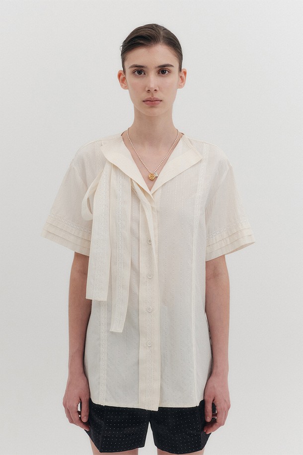 숏 슬리브 타이드 블라우스 - 크림