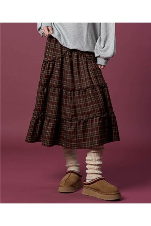 기모 도톰 체크 레이스 미디 플레어 롱스커트 [Wine_red] 가을 겨울 ver.