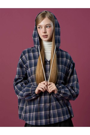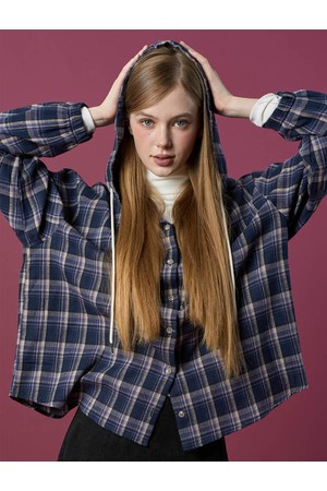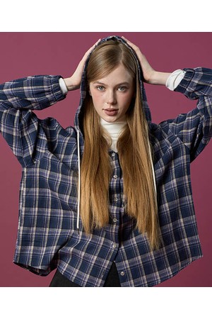 오버핏 데일리 기모 후드 체크 셔츠 [NAVY] 가을 겨울 ver.
