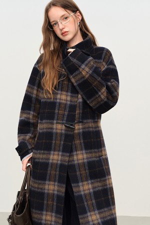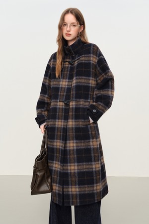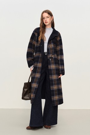 Plaid horn button belted coat