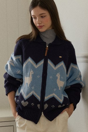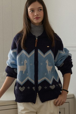 Alpaca Pattern Cowichan Knit Cardigan - Navy