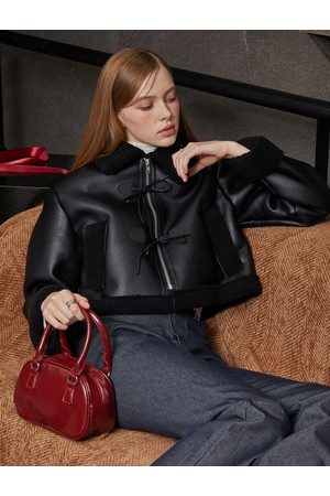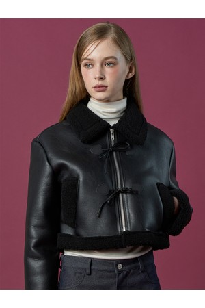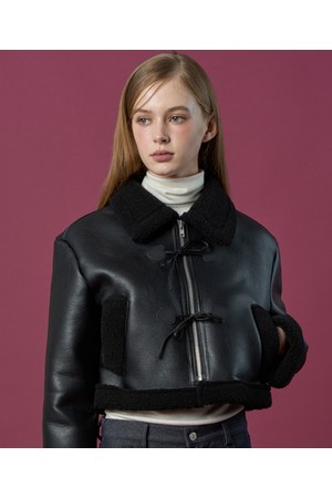 크롭 리본 비건 양털 무스탕 플리스 자켓 [All_Black]