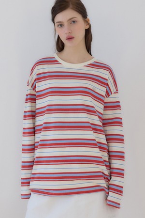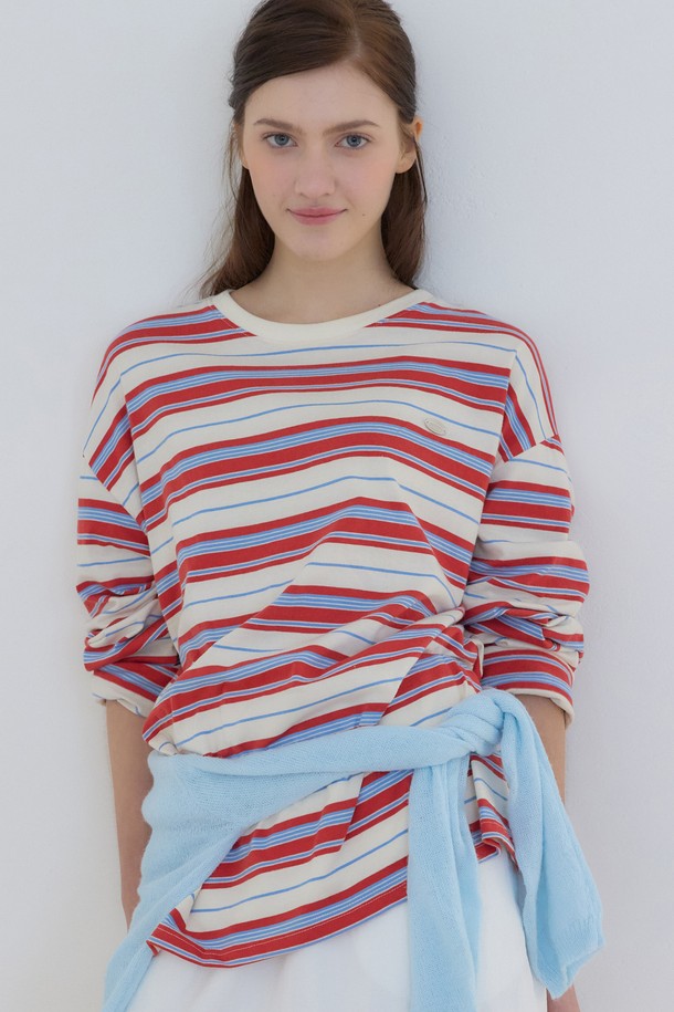 오버핏 로고 스트라이프 슬리브 티셔츠 - Red