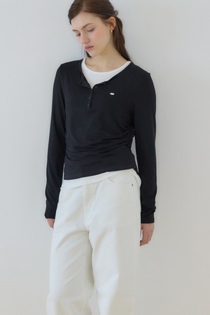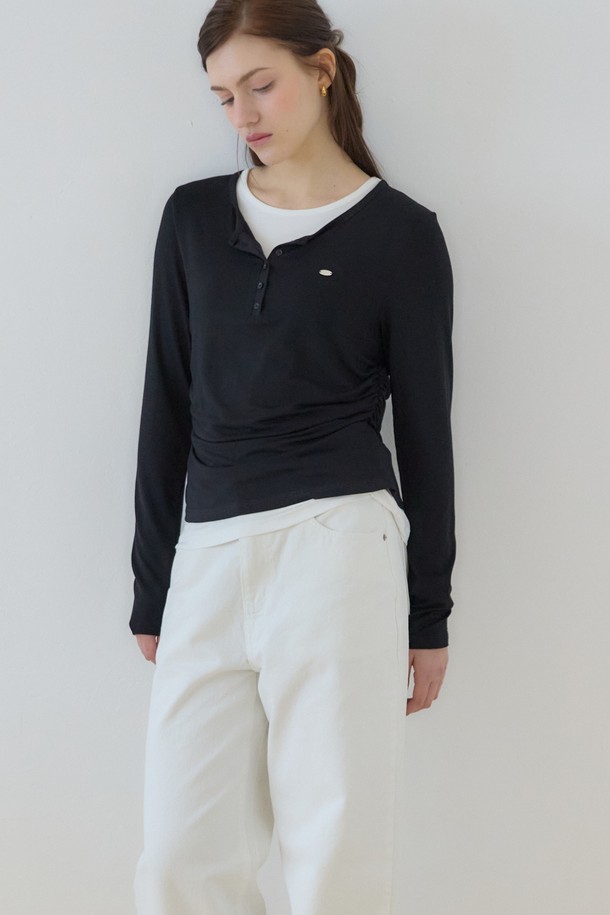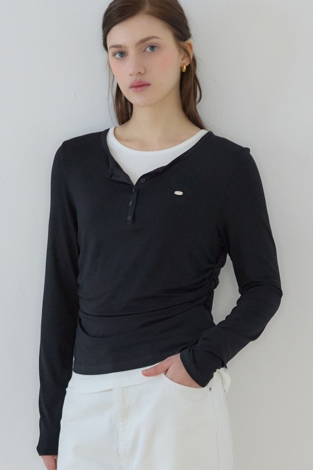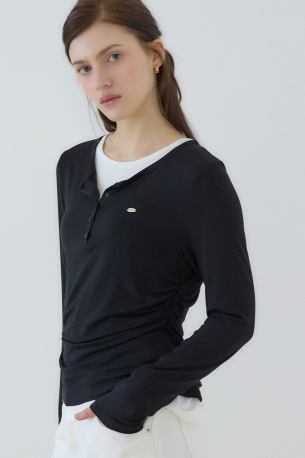 소프트 레이어드 버튼 넥 티셔츠 - Black