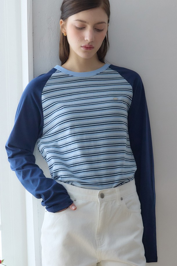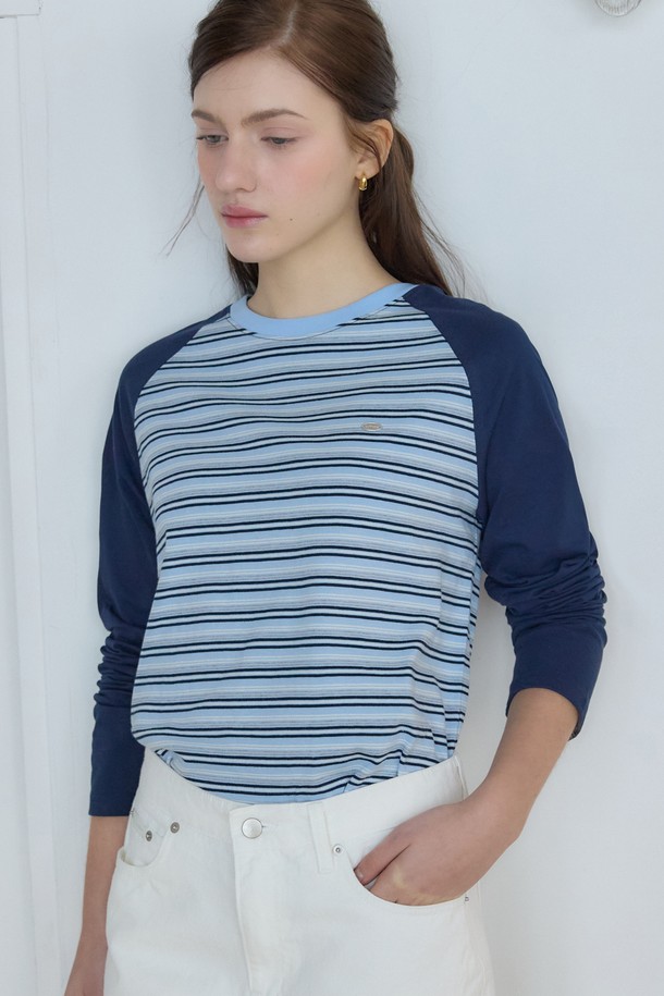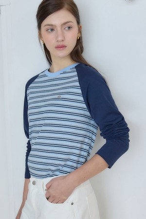스트라이프 투톤 래글런 티셔츠 - Navy