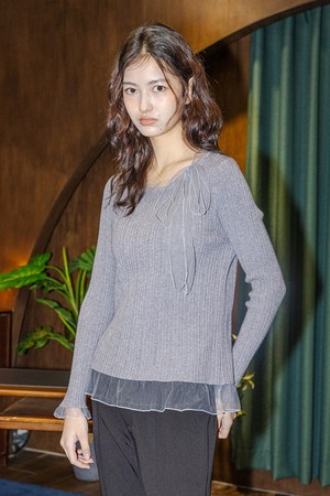 Mesh ribbon knit top_GRAY