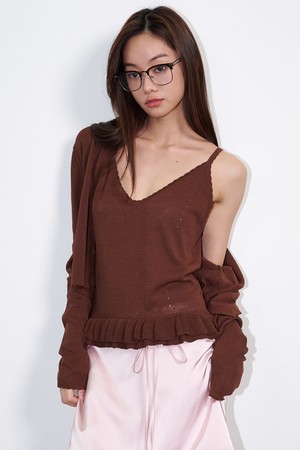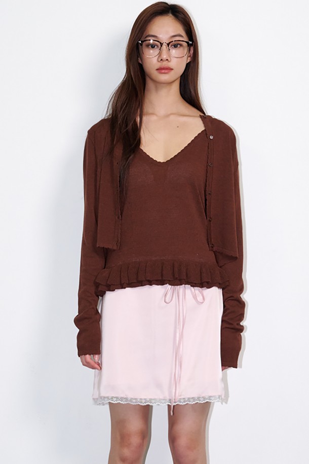 Linen Frill Sleeveless Cardigan Set Brown