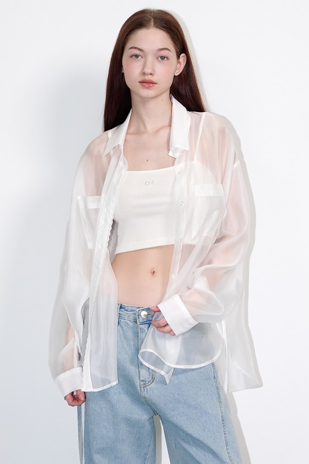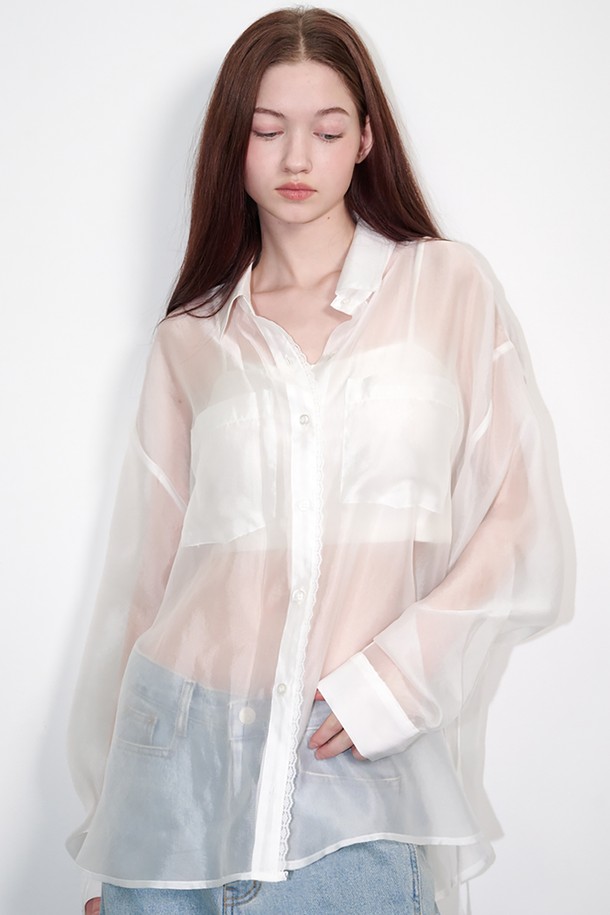 See-through lace silky shirt White