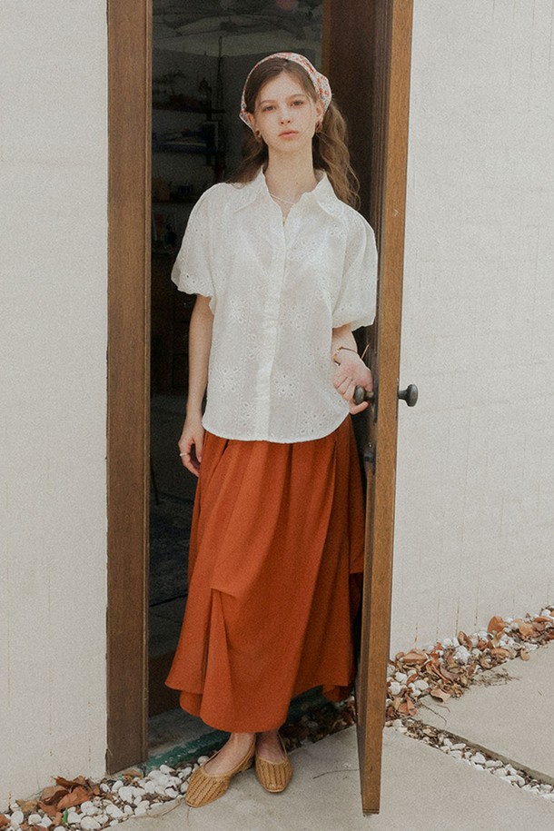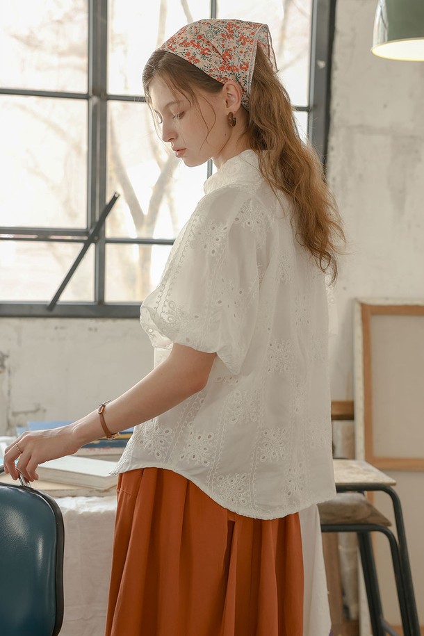 Embroidered short puff sleeve shirt_WHITE