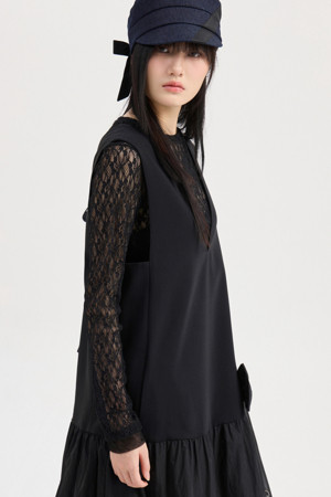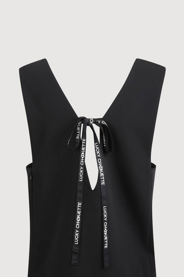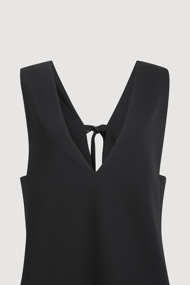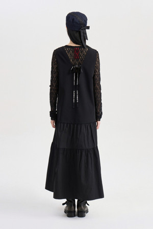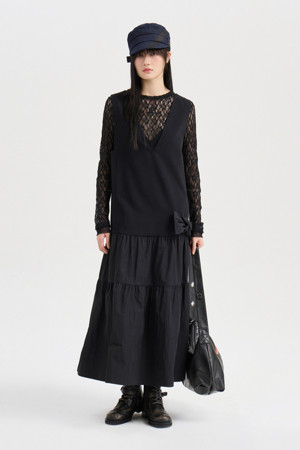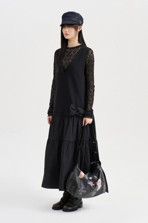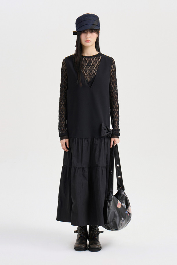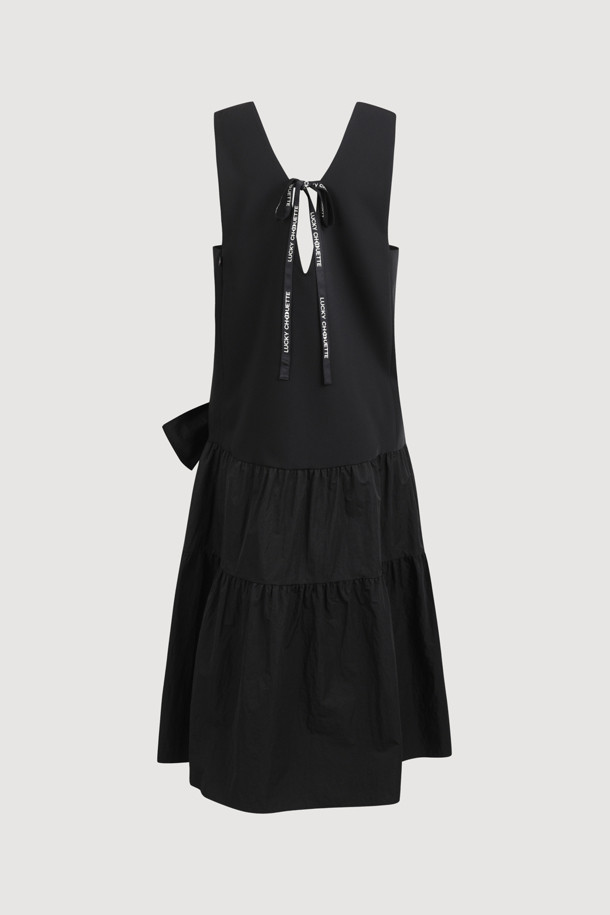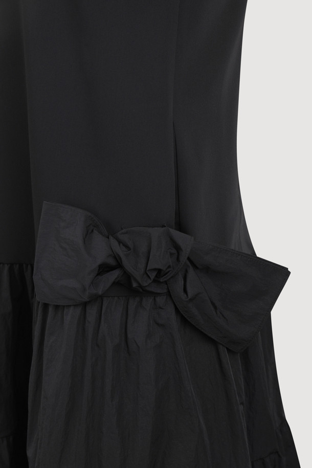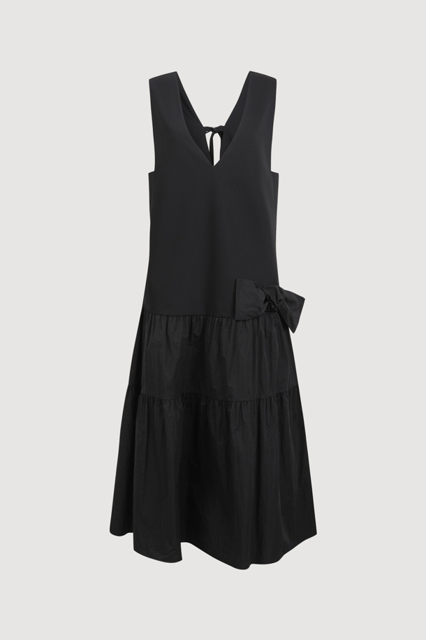 Ribbon Point V-neck Long Dress (black)