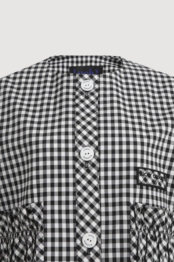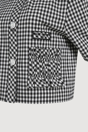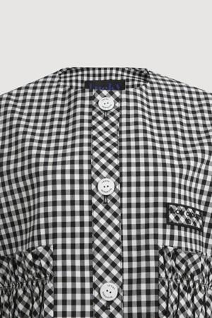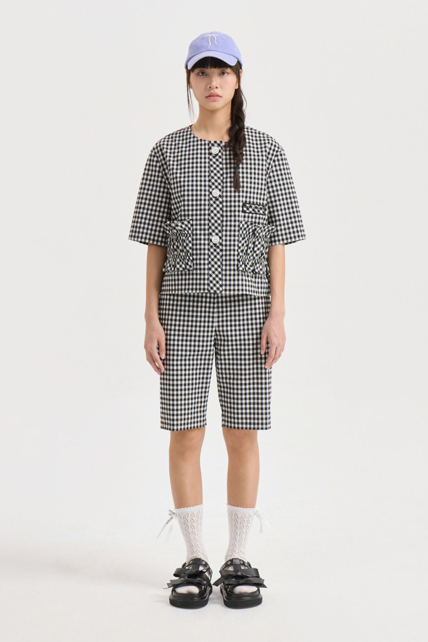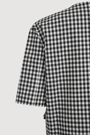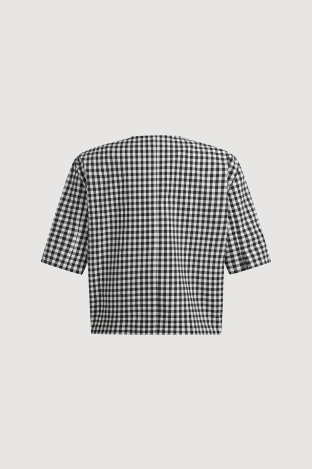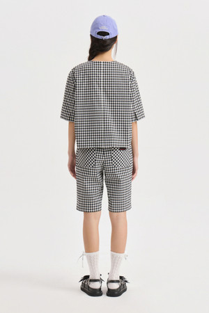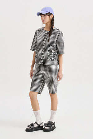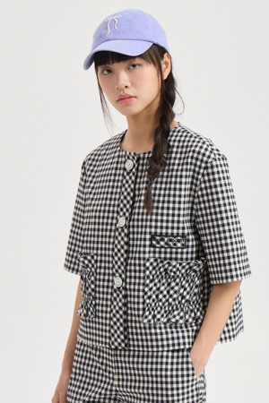 Gingham Check Round Neck Half Sleeve Jacket (black)