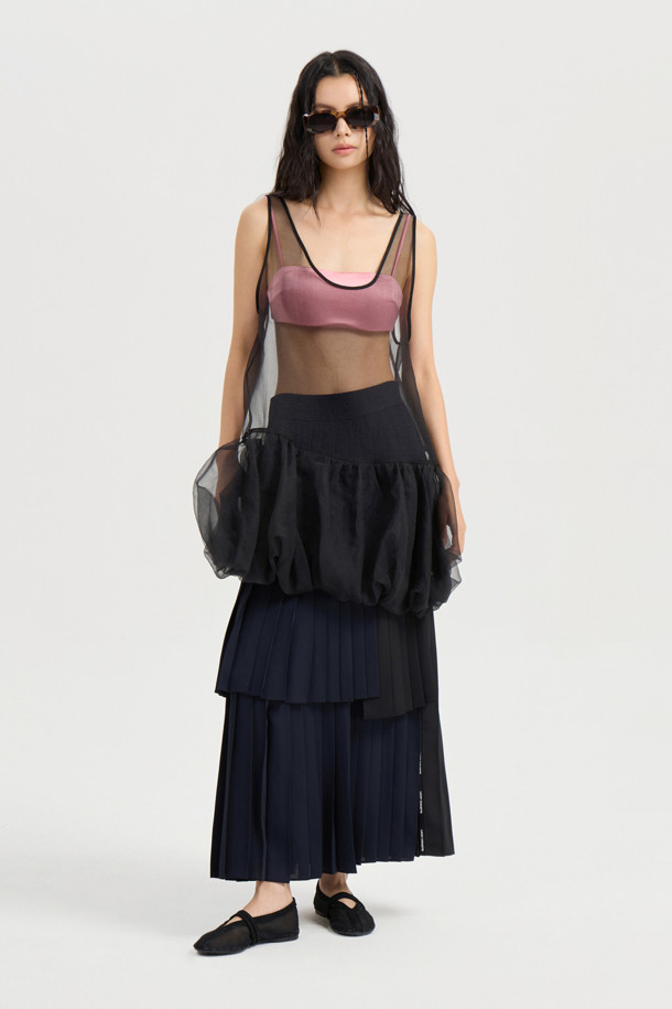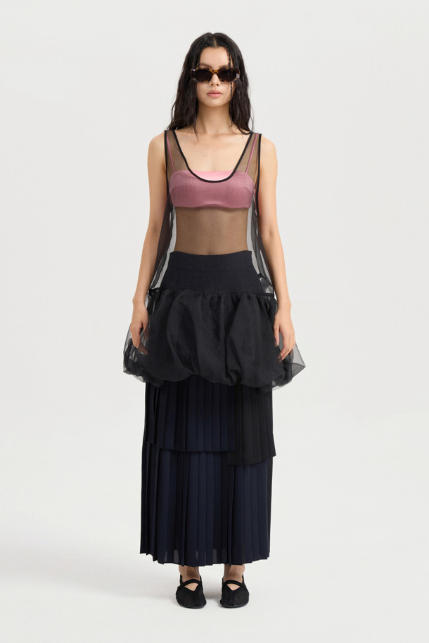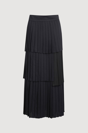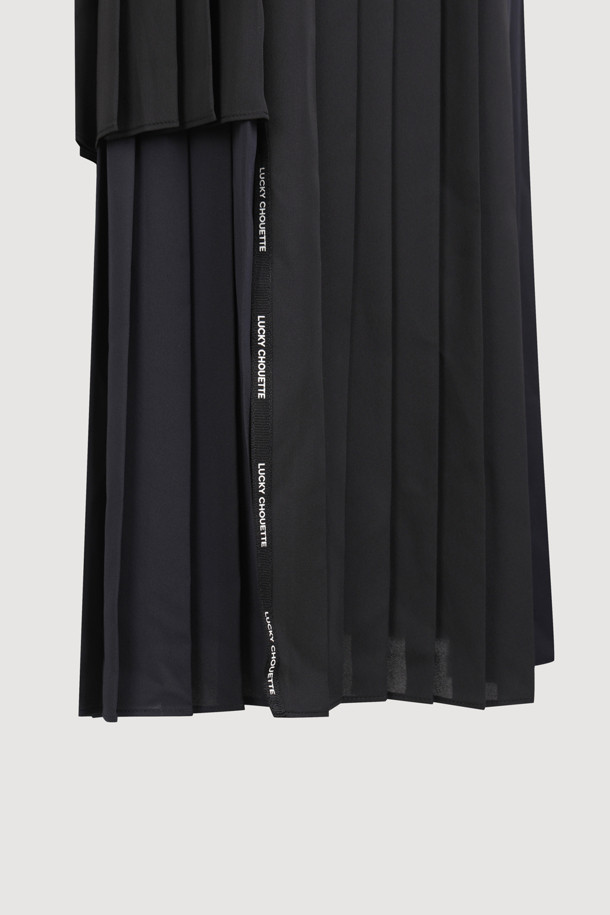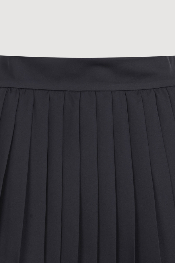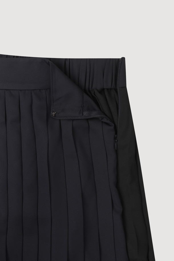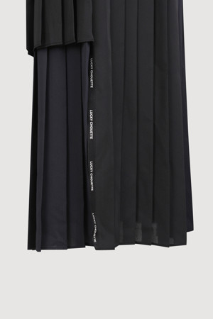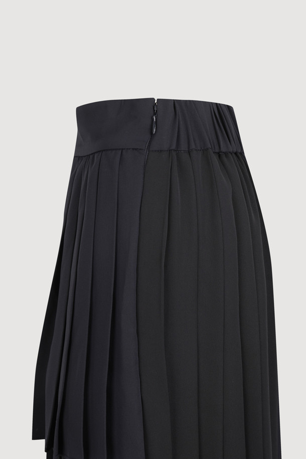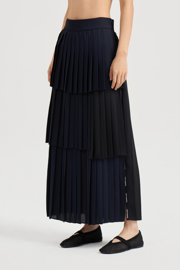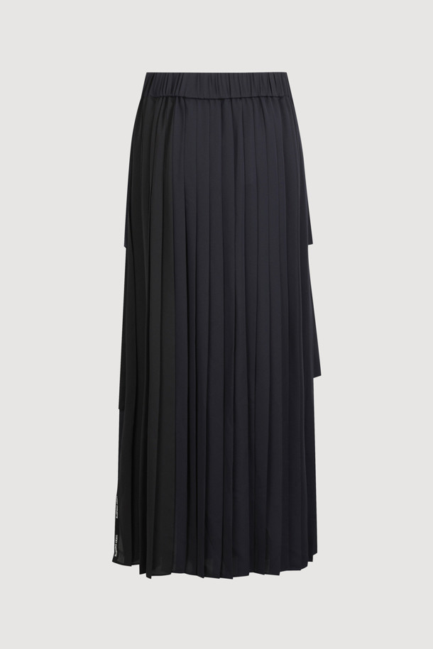 Color Mix Pleats Back Banding Long Skirt (dark navy)