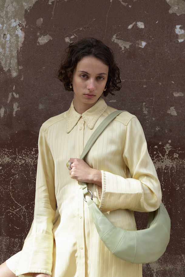 시그니처 소프트 램스킨 숄더백. 커브 라인과 입체적 실루엣이 돋보이며, O링 스트랩으로 숄더·크로스 연출이 가능합니다. 움직임에 따라 자연스럽게 흐르는 디자인입니다.