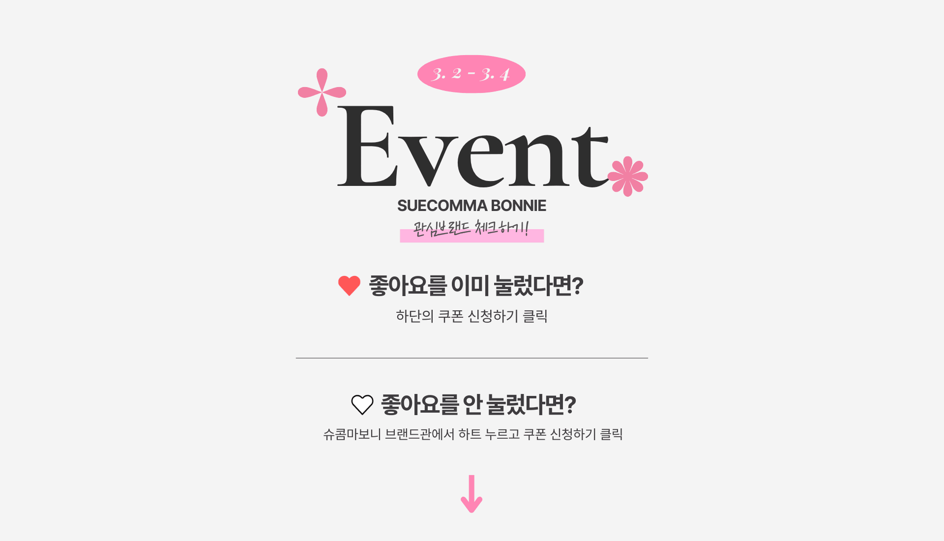· 슈콤마보니 브랜드관 ‘좋아요’ 버튼을 클릭하고 쿠폰 신청하기로 응모한 고객에 한해 5% 쿠폰이 지급됩니다.
